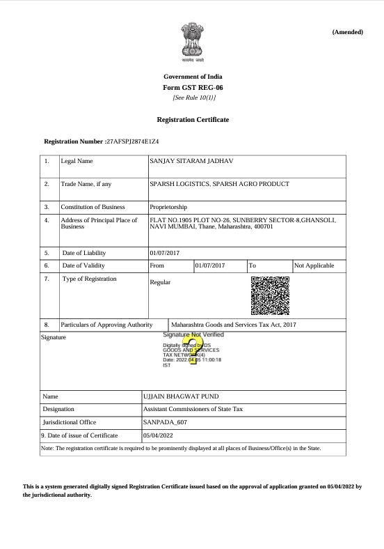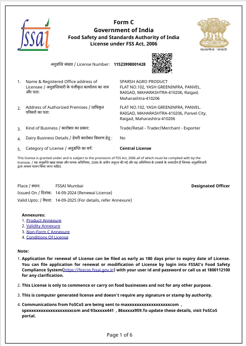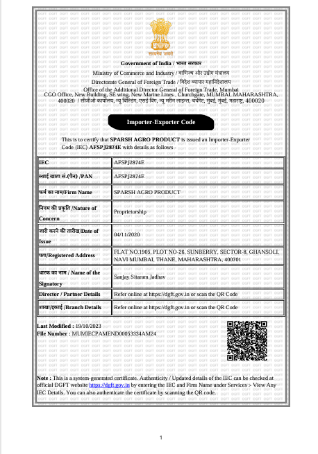 At SPARSH AGRO Product , transparency and compliance are at the heart of everything we do. Below, you’ll find our official certifications, including GST, IEC, FSSAI, and others, which reflect our commitment to meeting the highest standards in every aspect of our business.  Explore our certifications to see the foundation of trust we build upon.